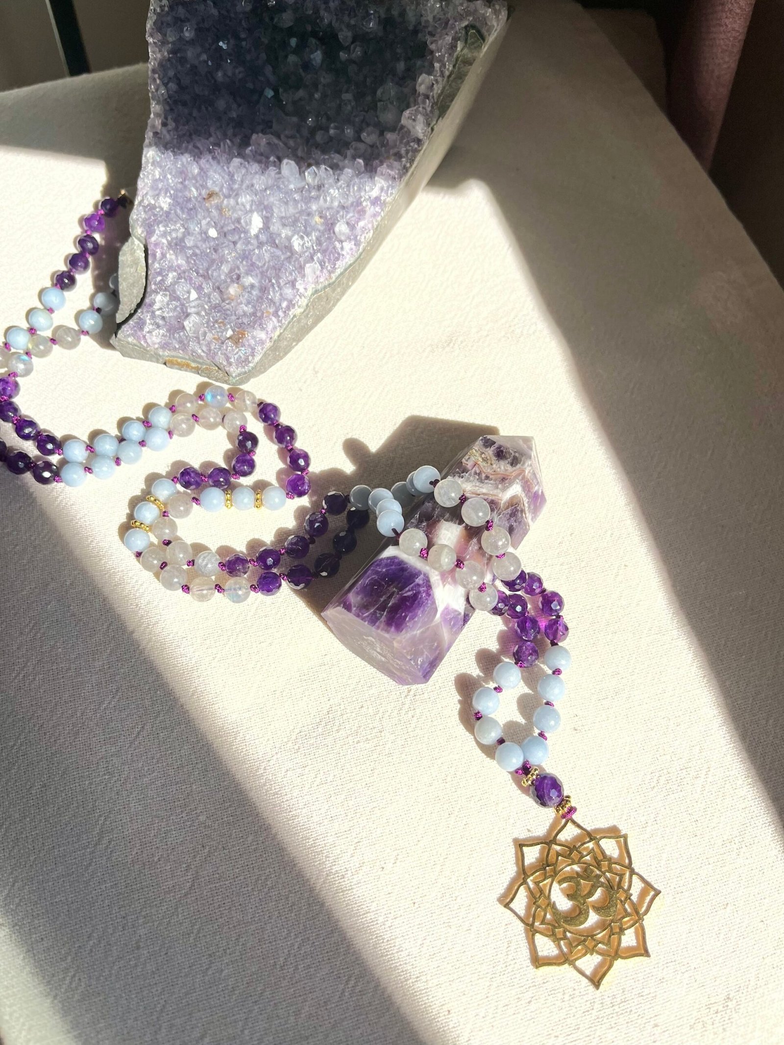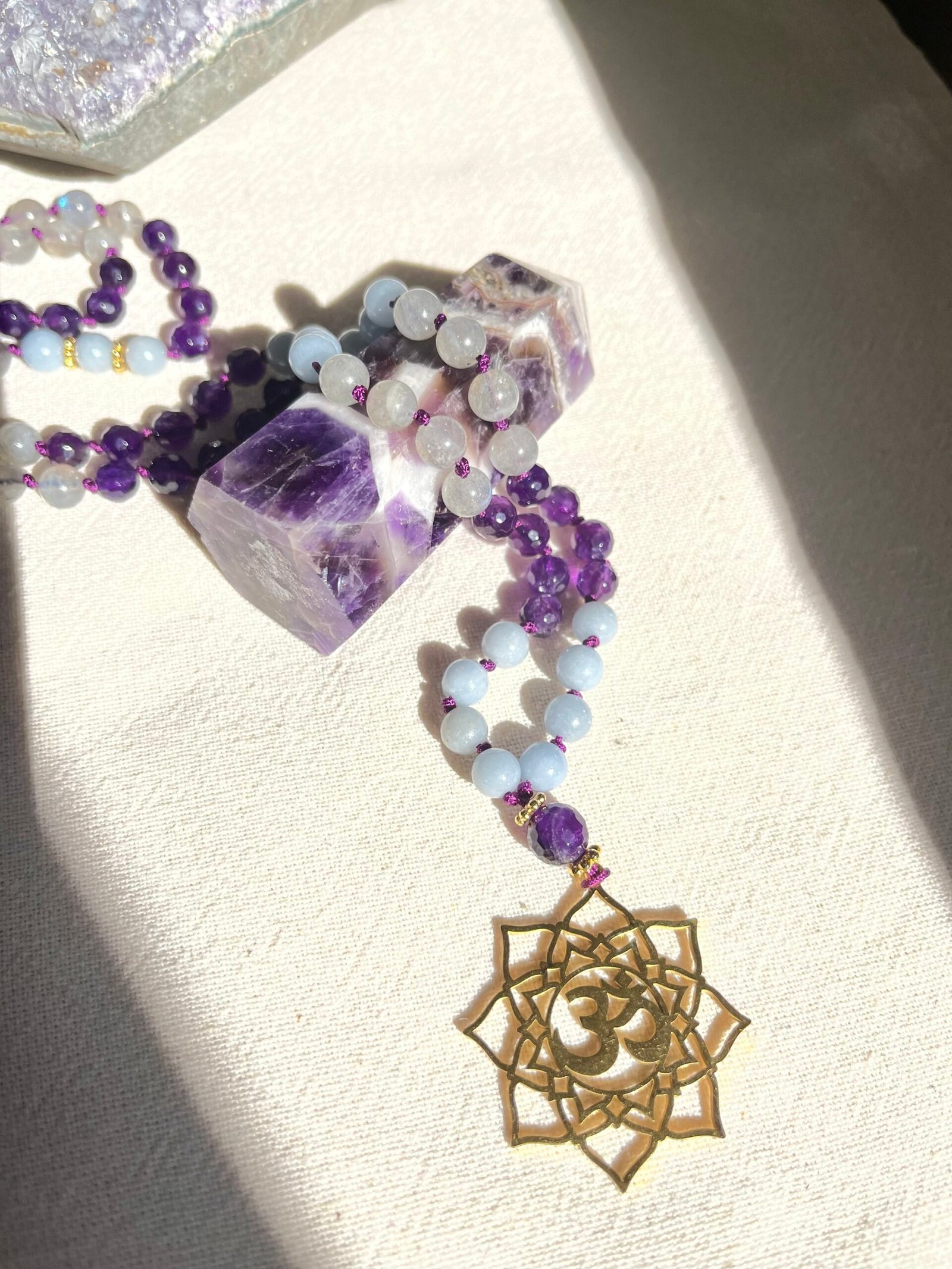 6 mm Angelit, Labradorit ve Faset Kesim Ametist taşları Taç çakra sembolü ile mor ip üzerinde bir araya gelmiştir. Guru taş olarak 8 mm Ametist kullanılmıştır.